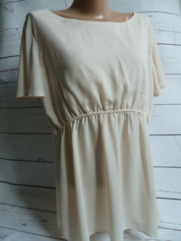 Блуза вільного крою Під грудьми встрочена резинка. Ззаду по спинці гудзики Пог 48 см загальна Довжина 68 см Довжина від плечових швів до гумки 34 см Від гумки до низу 35 см Напівобхват низу 66 см Плечі 40 см Довжина рукава 18 см