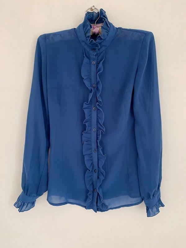 Красива легка синя блуза на гудзиках. Красиво виглядає з офісною одягом. Не мнеться. Матеріал дуже приємний. Не парить.