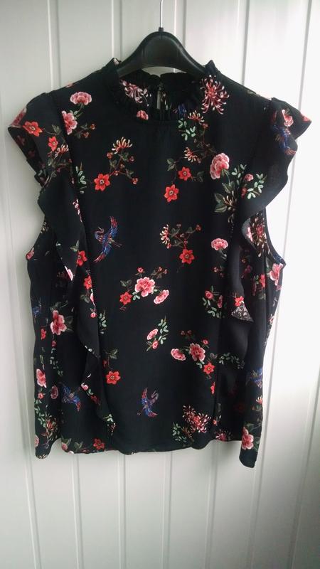 Романтичная блуза от F&F . Рисунок как будто вышит гладью - очень красиво смотрится. Ткань натуральная , хорошо ляжет по фигуре. Фактически не тянется. Длина 71 Ширина по плечам 42 ПоГ 58
