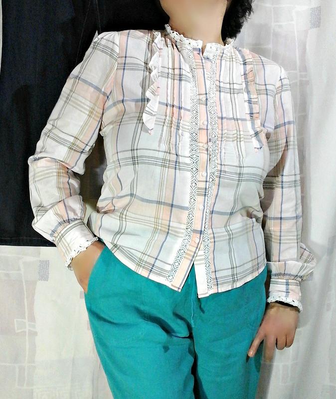 Блузка з тонкої бавовняної тканини в ніжну клітку, оздоблена натуральним мереживом вздовж застібки, по коміру і манжет. Напівприталений силует. На бірці розмір 14/42, підійде на наші 50-52. Заміри: довжина по спинці 61 см, обхват грудей 110, талії 106, стегон 116. Надіта на фото на параметри 116-92-116, зріст 170, тіснувата в грудях. Стан відмінний, без нюансів.