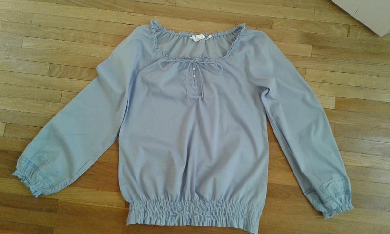 Ніжного блакитного кольору з довгим зібраним на куліску рукавом і зав'язкою на грудях, з ніжною красивою мережкою. Вказаний 38, але йде на 36 (s). Довжина 67см, внизу гумка 40см - тягнеться до 60см, ПОГ 51см, рукав від горловини 72си.