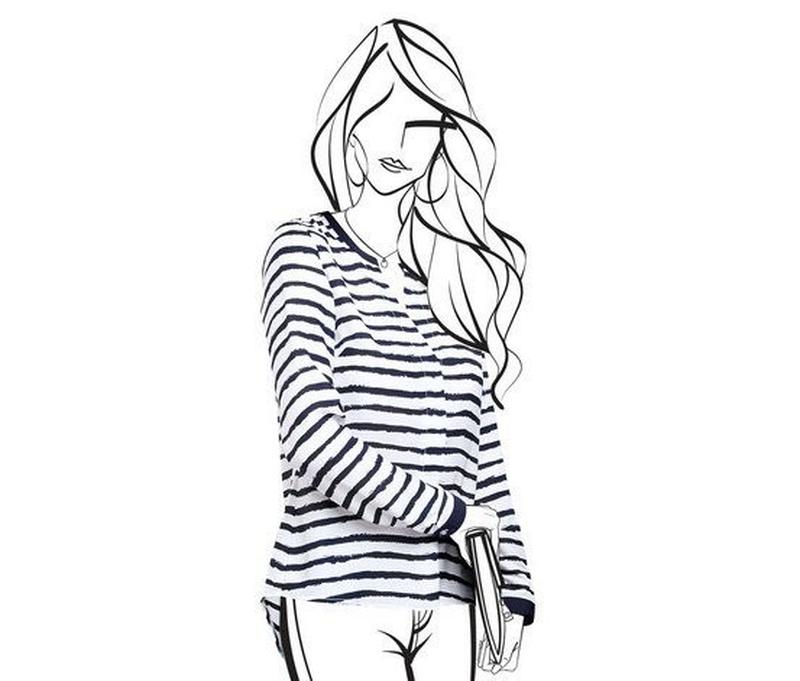 Блузка из легкого полупрозрачного материала, декорирована стильным графическим принтом. Широкий V-образный вырез с окантовкой подчеркивает декольте. По краям рукавов контрастный манжет. Свободный силуэт создает актуальный объем. Материал приятен на ощупь и легок в уходе. Декоративная обработка ворота. Состав: 100% полиэстер Размер 34 евро пог - 44 см длина - 64 см рукав - 60/45 см новая, бирка срезана