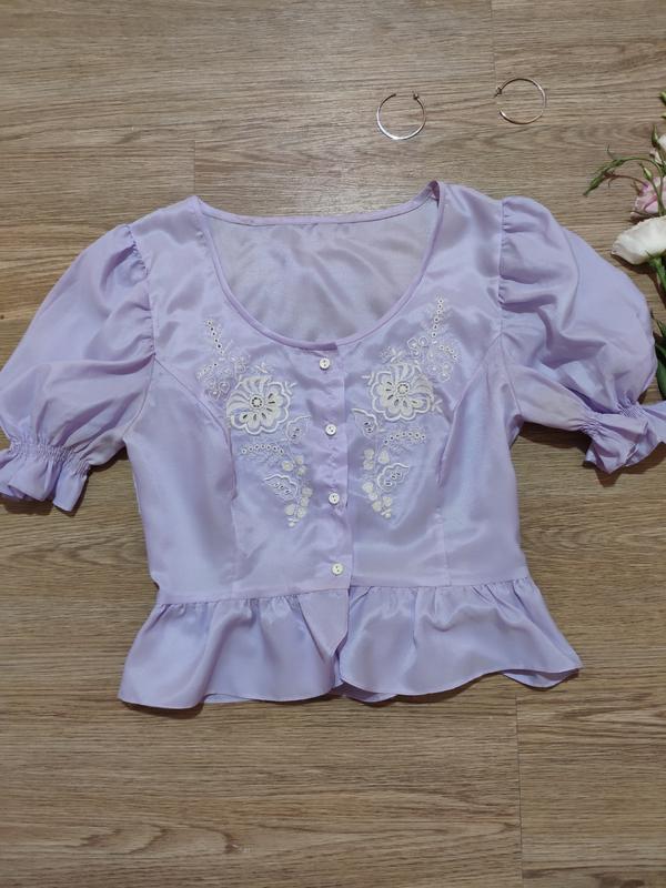 Блуза на пуговицах, с актуальными рукавами фонариками, ажурная вышивка, очень красивый цвет