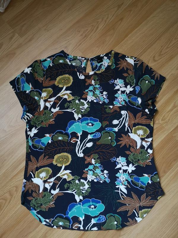 Яркая блузочка, боковые бирки срезаны, длина 64 см, плечи 38 см, рукав 14 см от плеча, от подмышки 2 см, ширина 18 см, подмышки 48 см, низ 51 см, вырез капелька на спинке 14 см, впереди слева по груди карманчик.