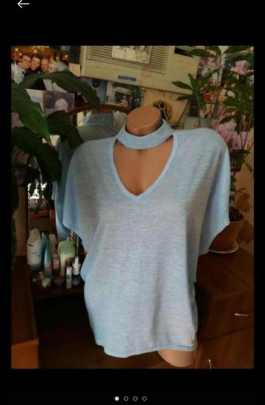 блуза віскоза небесно-блакитного кольору чокер стрази через всю спинку блискавка крій летючка