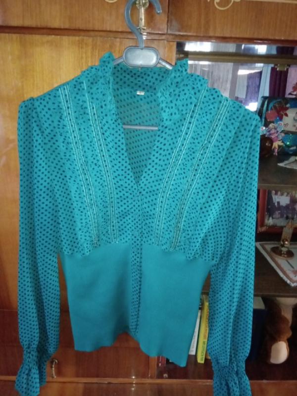 дуже гарна ошатна блуза кольору морської хвилі,комбінована-трикотаж ітонка тканина як шифон,модна в горошок,без дефектів,якість дуже хороша,фірмова,при потребі додам заміри