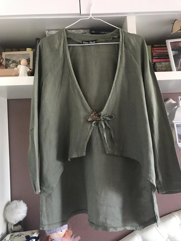 Блуза льняна на зав'язці.Річ у стані нової. .Ді(перед)-53см-61см.Спинка-79 см,Ог.-106см,Дл.рук від шиї.-73см,Шир.спини по плечах.-42см