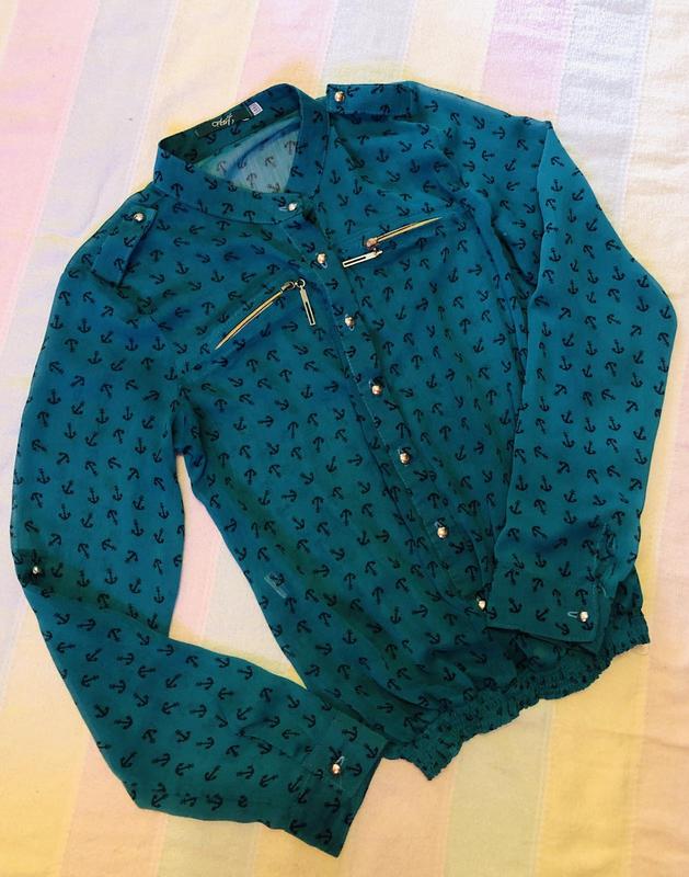 Новая блузка красивого зеленого цвета с якорямм, приятная лёгкая ткань шифон, внизу на резинке, застегивается на пуговки до резинки, свободная, размер С-М, длинна блузки 60 см, по вопросам пишите в сообщения.