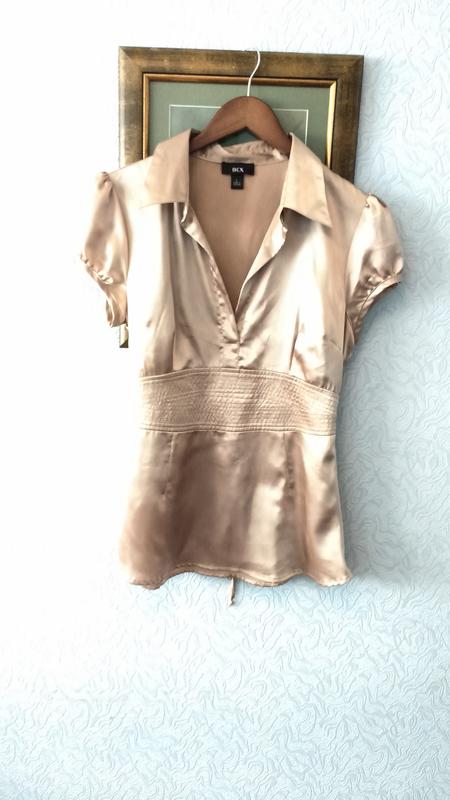Красива блузочка під атлас, золотого кольору, поліестер, з коротким рукавом, на 12 розмір, з потайною змеечки, колір світло-сірого золотий, не рожеве золото, як на фото, дуже ефектна, довжина по спинці 67, ПОГ 52, тканина не тягнеться.