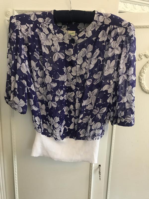 Шикарна вінтажна блуза . Італія. Склад:віскоза-100/. Дуже вдалий фасон:талія на високій гумці з віскози білого кольору, верх-про»єдиний, спереду застібається на ряд гудзиків, рукав довжиною до ліктя. Тканина легка, повітряна. Квітковий принт біло-фіолетової гами. Є подплеснем. Дуже гарно сідає по фігурі. Розмір на бірці -44 . {Італійський}Заміри:довжина-60 см, ПОГ-55 см, ПОБІДИ {гумка}-34 див. , рукав-34 див. Дуже красива !