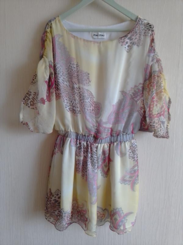 Красива легка шикарна блузка! Спокійні тони, вільний рукав зі складанням по плечовому шву, резиночка по талії. На підкладці з маечным кроєм 3 фото. Підійде на xs, s, m. Укорочена шовкова куртка фіолетового кольору Miu Miu, також є у продажу, більше фото з описом на профілі. Орієнтуйтеся будь ласка на заміри. З безпечної оплатою не працюю, з задоволенням відповім на всі питання! Довжина 82. Довжина до резиночки 44. Піт 35......49