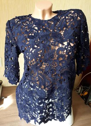 Красивенная кофта блуза из набивного ажура. Цвет насыщенный синий. Состояние новой вещи. Не подошла по размеру. Замеры: плечи - 37см, длина рукава - 33см, длина по спинке - 63см, под мышками - 46см, ПОБ - 54см. Смотрите другие мои объявления! Приятных покупок)