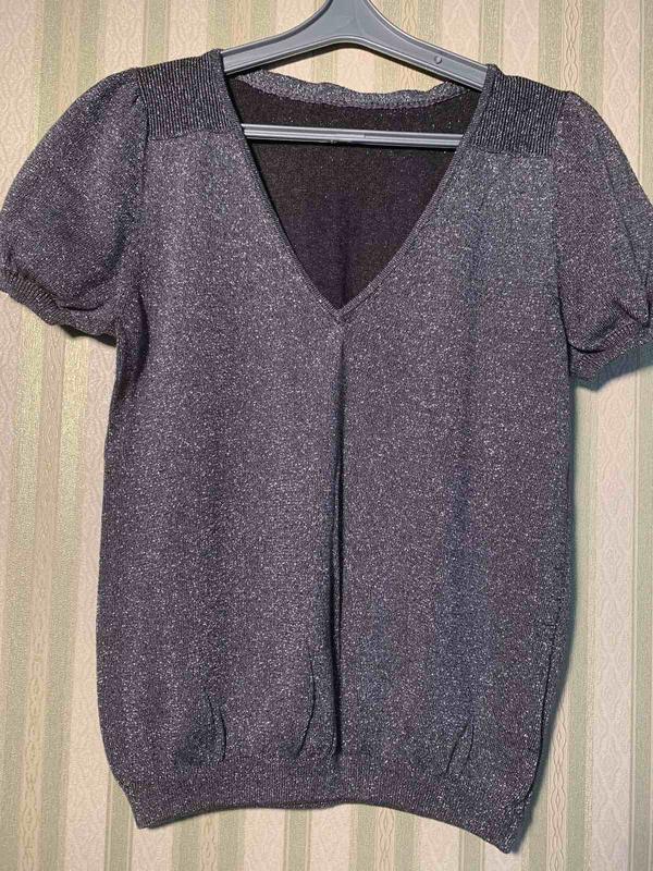 Стан ідеальний Люрексова V образний виріз Рукав і низ ( гумка ) на манжеті Добре тягнеться Складу 78% Катон 13% нейлон 8% люрекс Виміри Плечі 33 Рукав19 Пог 42 Піт 40 Побіди 29+ Довжина 56