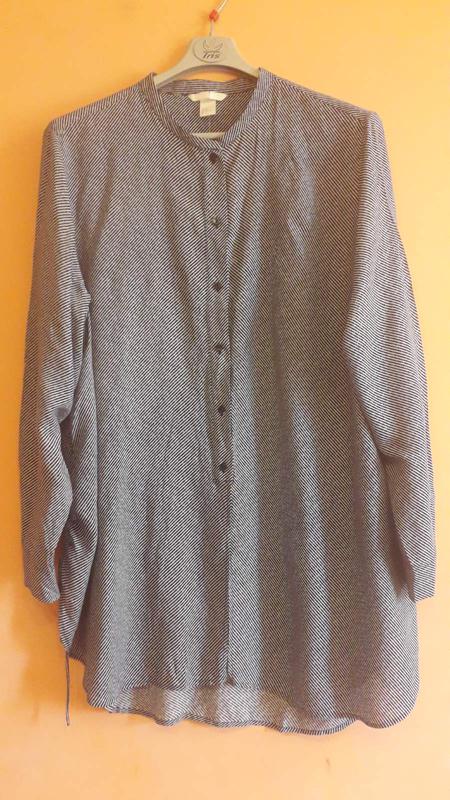 оригінальна блуза, з довгим рукавом, коміром стійка, з боків стьобані зав'язки, який можна регулювати на більше і менше і які прикрашають блузу, стійка з гудзиками не до кінця всієї довжини блузи, зад трохи довше переду, яскраво білий колір не в синю дрібну смужку, розмір 46 європейський, ПОГ-64см, плечі-47см, довжина рукава-62cm, довжина виробу попереду-86см, ззаду-95см, 100% віскоза, блуза дуже легка, вільна і зручна, стан новий, але без бірки