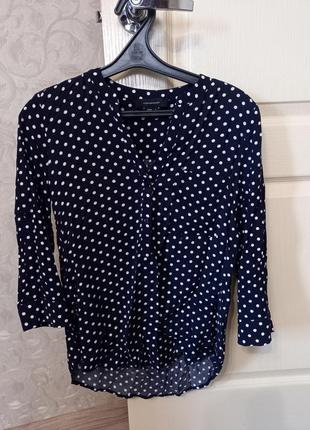 Блузка в ідеальному, новому стані. Склад: 100% віскоза. Колір синій в білий горох. Спинка довше, рукав регулюється. Розмір 8(36). Добре буде на S-M. Якщо є питання-пишіть. Повернення немає.
