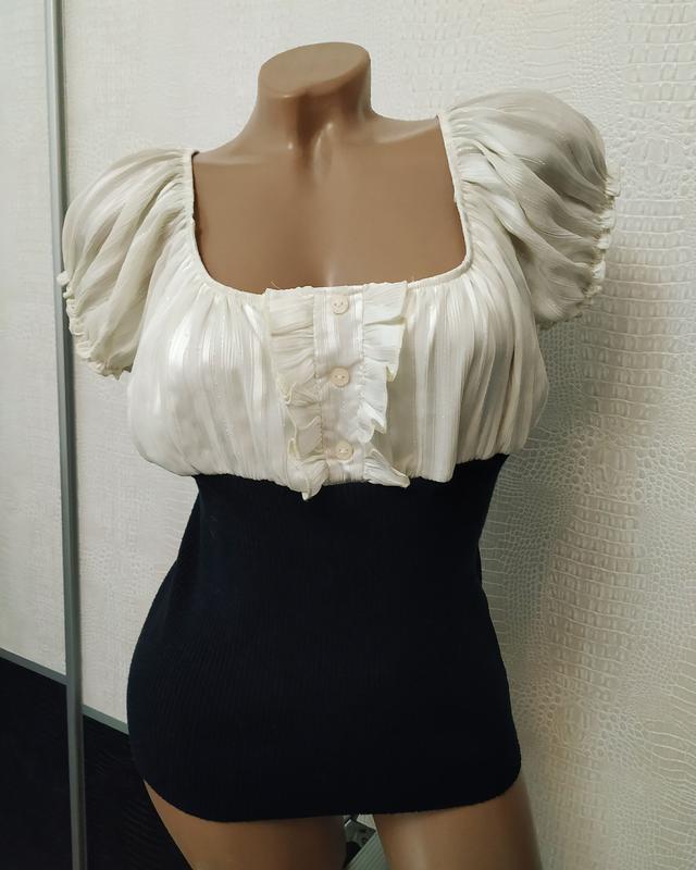 р. М Низ трикотажна гумка.(чорний колір) Добре тягнеться. Верх напівпрозорий.Трохи люрексу. Довжина від плеча 57см Ширина по нижній частині,не розтягуючи Ширина 31см між пахвами 47см Якісна і красива річ. Стан нової речі.