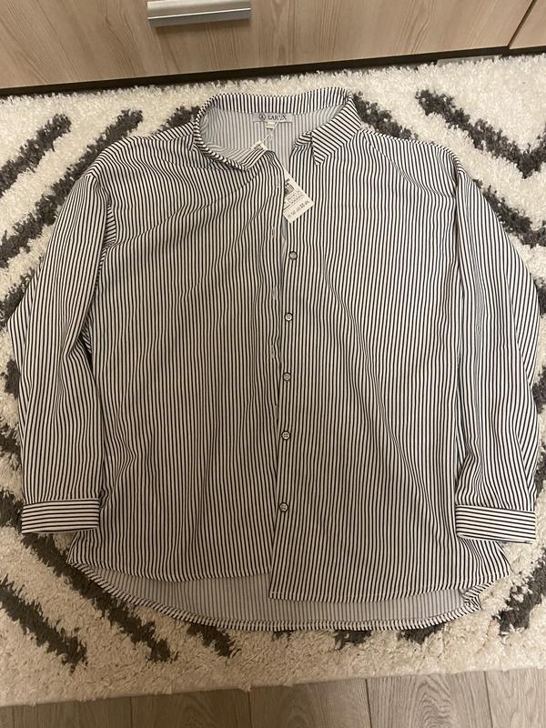 розмір S, сорочка з биркою, ні разу не вдягала на бірці написано що поліестер, але тканина приємна😇 сорочка у вертикальну смужку, тому буде чудово стрункості 😜