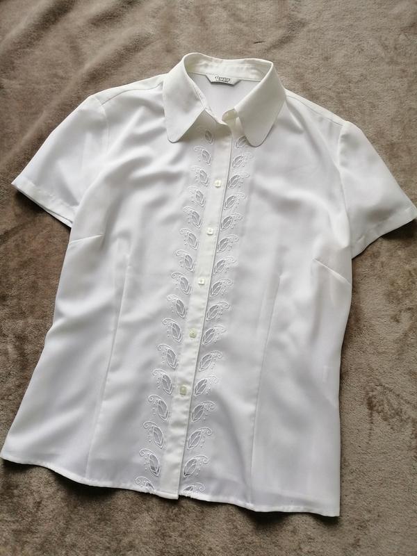 Дуже красива білосніжна блузка від Berkertex by Classics, шикарна англійська якість. Строга, але водночас витончено ошатна. Приталений класичний фасон з витачками. Короткий рукав. Витончена вишивка з вставками з органзи по обидві сторони планки з гудзиками, закруглений комір, з боків розрізики. Дуже приємна шовковиста тканина, майже не просвічує. Розмір 12. Дивіться виміри. Довжина 59 см Плечі 40 см ПОГ 51 см + виточки ПОТ 45 см ПОБ 54 см