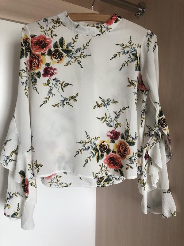 Красива блузка в квітковий принт. Рукави внизу розширені, йдуть хвилькою Стан нової. Розмір Xs-S