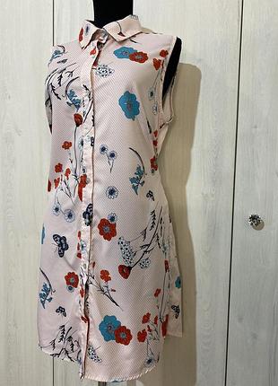 Блуза/туніка дуже красивого принту! Тканина синтетична, але м'яка, ніжна. Завязується ззаду, має два розрізи по боках. Розмір L. По плечах 34, по грудях 49, по талії 48, довжина 84.