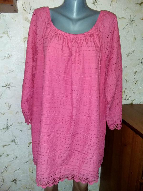 Розмір вказано 52/54, дивіться виміри. Стан відмінний, без дефектів. Тканина як футболка, середньої щільності, 100% бавовна. Попереду зверху основної тканини нашита прошва, 100% бавовна, тобто попереду блузка з двох шарів. Рукава - прошва, 100% бавовна. Колір рожевий, не яскравий. довжина від верхньої точки плеча до низу 80. довжина рукава від горловини 60. п/про біцепса 24. п/про грудей 65, дотримуючи всі сброчки. п/о талії 69, дотримуючи всі сброчки. п/про внизу 73, соблюлая всі сброчки. 31