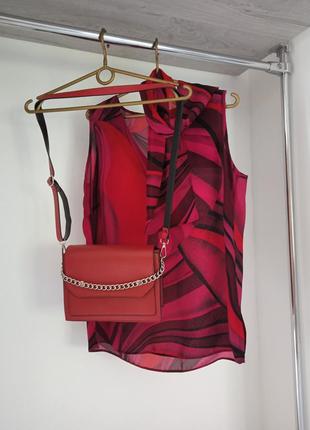 Класична блузочка без рукавів з оригінальним контрастним малюнком у червоних тонах. Легка та комфортна. Приємна до тіла. Шифон. Лягає вільно. Прямий Фасон. Є виріз-декольте в світові. Прикрашена хустинкою в тон. Є розміри.