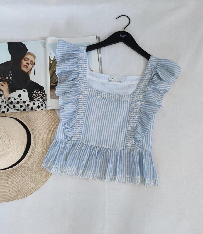 🌿голуба блуза від Zara з рюшами, прямий крій, тканина з підкладкою Розмір:S Заміри:З грудей 44 см, довжина 47 см Склад:котон