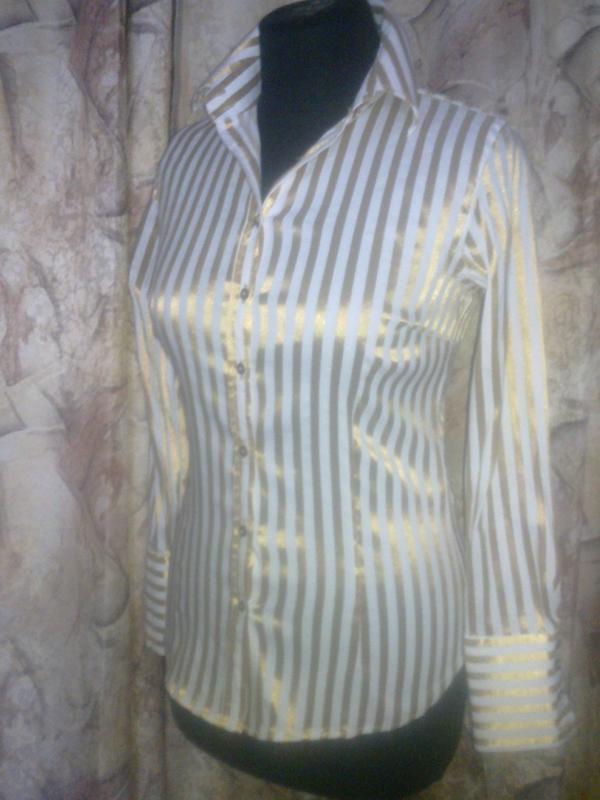 Стильная. нарядная рубашка, белого цвета в золотистые полоски, имеет классический, приталенный. прямой фасон. Рубашка имеет небольшой, отложной воротничек, со стойкой на 2пуговки. Рукава имеют широкие манжеты на 4пуговки. Шитье и качество, на высшем уровне! Изготовлена бренд.фирмой в Марокко, из 40%полиестера, 32%коттона, 25%полиамила и 3%эластана, приятная, мягкая, тонкая, стрейчевая ткань, отлично тянется. Размер S, состояние отличное, новое, навесных ярлыков нет. сток. РАЗМЕРЫ: ПОГ.=46см, ПОТ.=39.5см, ПОБ.=48см, Длн.издл.=64см, Длн.рукв.=60см, Шир.плеч=39см.. ЛОТЫ КОМБИНИРУЮ!!!!