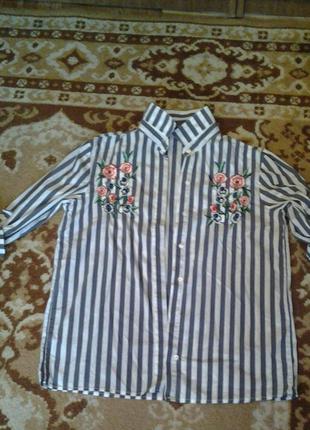 Виробництво Туреччина . Актуальна сорочка в смужку з вишивкою . Довжина від коміра до низу 72см, без коміра 66см. Під пахвами 50см . Довжина рукава 55см, рукав підвертається на хлястик . Плечі 40см. Стан нової речі, тобто була одягнена один раз.