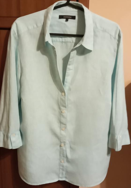 базовая рубашка из 100% льна от премиальнлго бренда Jaeger,в 14 размере,цвет голубой меланж, пуговички брендирлваны, состояние идеал,в состоянии новой. ПОГ 51, длина 65,длина рукава 44 (три четверти), плечи 40. полная предоплата.