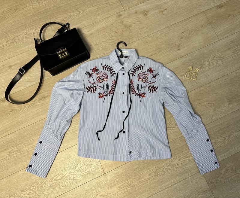 Очень стильная рубашка с вышивкой, бархатными лентами и пуговками, необычный крой рукава, бирка с составом срезана, но на ощупь 100% котон Состояние идеал Указан размер xs, подойдет на размер xs-s, небольшая m
