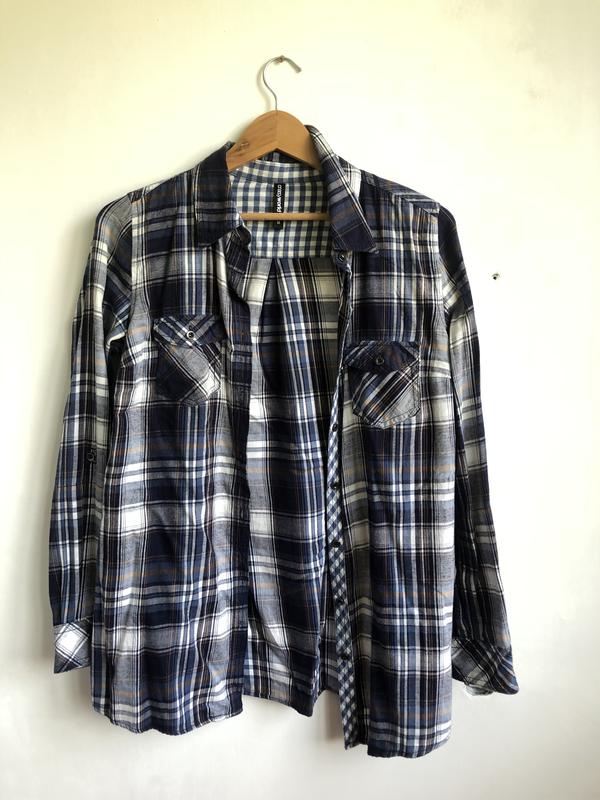 Котонова рубашка в клітинку Колір: синьо-білий, є невеликі помаранчеві вставки, дуже приємна до тіла Матеріал 100% котон Розмір: М В комплекті є запасний ґудзик Відправлю в день замовлення