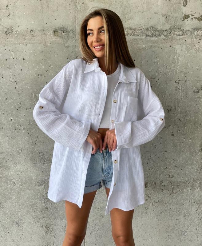Легкая, натуральная рубашка из нежного муслина!! Ткань: Муслин (100%хлопок!) Размеры: Универсал Цвета: Беж, Голубой, Нежно Розовый, Белый Тканина натуральна, не парить! Существует множество вариантов, как носить рубашку (как отдельную вещь, или же как накидку). Рукава закатываются и защелкиваются на пуговицу Naomi2004 ЗАМІРИ МОД.2004 Размер: Универсал Ог до 120см , От до 116см, Об до 120см Длина: 79/84см