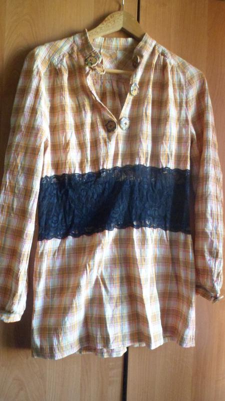 тунічка з прозорою широкого резінкою на талії. На розмір м. Довжина 75. бюст 55. на талії резінка. бєдра 55 . Недолік – на одному з рукавів потрібно пришити гарно ґудзика ( пуговка), так як тримається на чесному слові. Додаткові заміри не надаю.