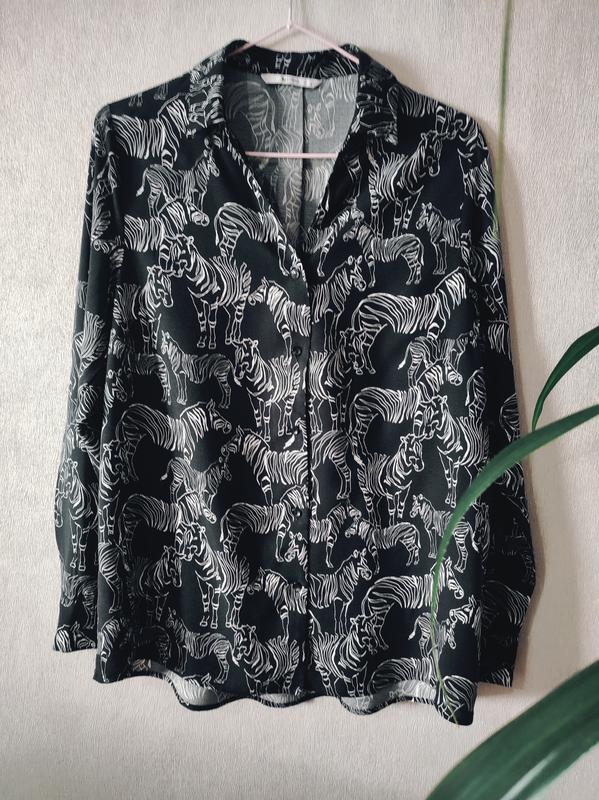 сорочка блуза, склад 100% віскоза, стан ідеальний, анімалістичний принт, без зауважень і дефектів, заміри на розмір 46-48: довжина спереду 69см, ззаду 73см, довжина рукава 61см +плече 11см, ширина під рукавами пог 51см