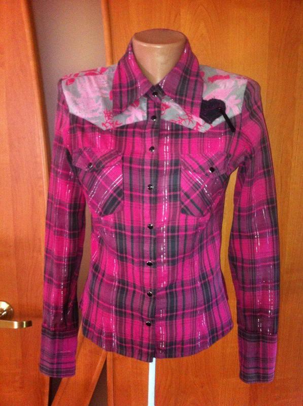 Женская рубашка в клеточку малинового цвета с черным. На ней есть красивые вставки на плечах, принт-листочки. А также есть нашивка в виде сердечка. Размер-36. Ткань-Х/Б. Очень красиво сидит по фигуре.
