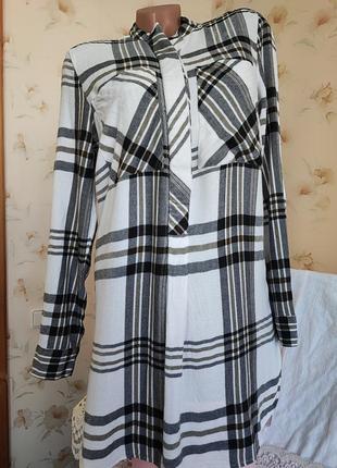 Чудове брендове плаття-сорочка у велику карту. Прямого крою, до пояса потайна застібка на ґудзики. Дві великі нагрудні кишені. Комір-стійка. Тканина на дотик, як баечка, м'яка, приємна до тіла.ПОГ-ПОТ-ПОС 50-50-52 см. У плечах 40 см. Довжина рукава від плеча 62/45 см, укорочується на ґудзичку. Довжина по спинці 88 см. Стан ідеальний. Дефектів немає.
