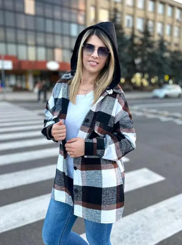 Рубашка в клетку оверсайз "Ultra" Также в наличии размеры 42-44, 46-48. Теплая рубашка в клетку с капюшоном – обязательный элемент женского гардероба в осенне-весенний период. Это незаменимая вещь в арсенале современной модницы! Такая рубашка с легкостью заменит верхнюю одежду, защитит от ветра и холода, а также удачно впишется в любой повседневный образ. Удлиненная теплая рубашка куртка в клетку имеет следующие особенности: - свободный фасон оверсайз; - длинные рукава с манжетами; - на груди расположены большие карманы с клапанами; - по бокам есть небольшие разрезы; - капюшон отстегивается. Изготовлена теплая женская рубашка в клетку из плотной ткани, в составе которой находится шерсть. Материал имеет мягкую ворсистую текстуру, поэтому приятный на ощупь и создает ощущение уюта. Капюшон из трикотажа трехнитка (на флисе) и пристегивается с помощью пуговиц Характеристики Стиль:Casual Сезон:Осень/зима Длина от плеча:78 см Длина рукава от горловины:75 см Материал: Шерсть, капюшон трехнитка  Таблица размеров Наличие на складе Цвет 50-52 Черный с белым✓ Голубой с серым✓ Электрик с серым✓ Шоколадный с черным✓ ✓ — в наличии (количество ограничено).
