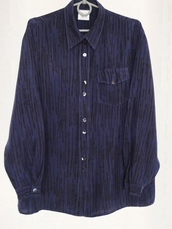 Фирменная рубашка в идеальном состоянии.Темно-синяя в черную полоску.Материал шелк .По бокам есть разрезы. Замеры: длина -70см ширина плеч -44см пог-58см длина рукава -60см