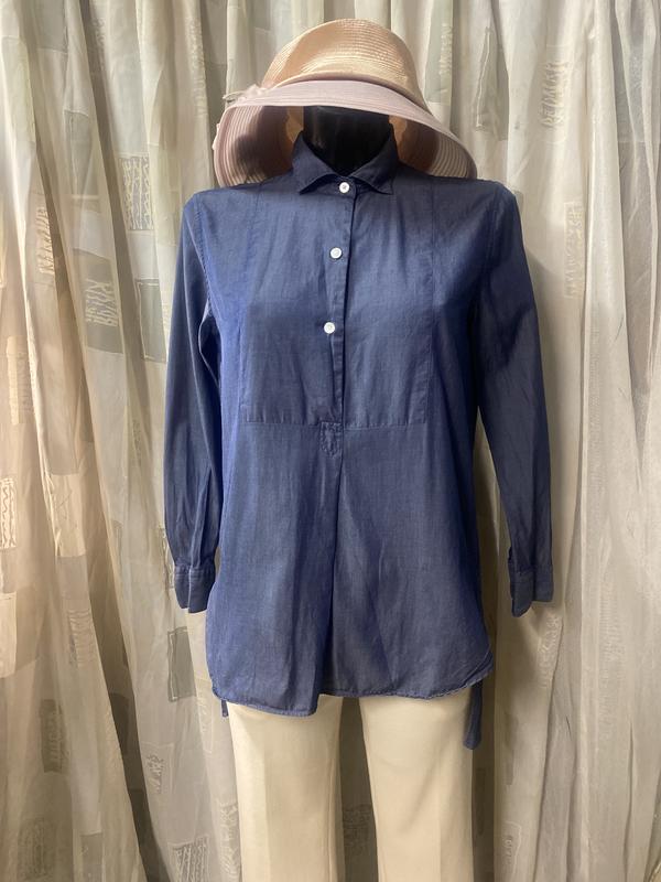 Стильна якісна легка сорочка від Acne Studios. Колір синій. Спинка подовжена, застібка до талії. Бірка із складом зрізана, але на дотик-дуже схоже на ліоцелл(чи котон/ліоцелл). Розмір по бірці-36. Заміри:довжина по спинці-74 см, спереду-68 см, ПОГ-47 см, ПОЯб-48 см, рукав вкорочеий.