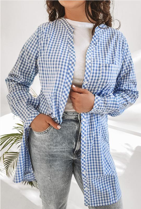 Женсеая рубашка из поплина в клетку с застежкой на пуговицы. Размер: 46,48,50. Рукав длинный на манжете. По длине регулируется с помощью хлястика и пуговицы. По бокам разрезы.