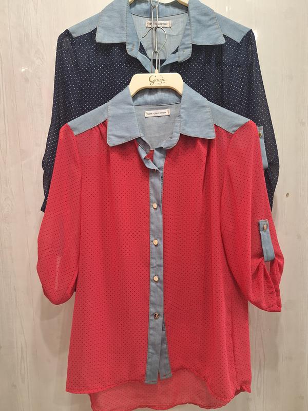Блуза шифоновая в мелкий горошек с джинковой отделкой. На пуговицах. Рукав 3/4.Спинка удлинена. Производитель Польша. Хорошо ложится на Размер Xs-S.