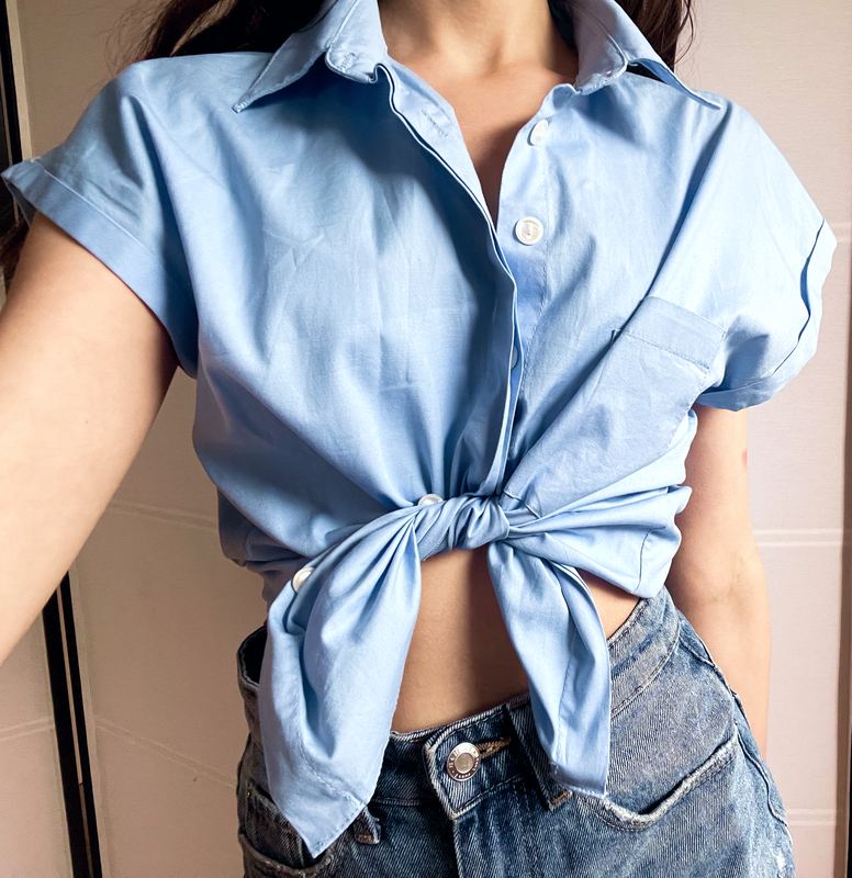 Дуже крута бавовняна блакитна рубашка з коротким рукавом! Її можна носити багатьма способами - зав'язавши попереду, на випуск, заправляти повністю або частково - все залежить від вашого настрою та фантазії! Виглядає в будь-якому випадку стильно та виграшно! Тканина: бавовна, дихаюча та приємна до тіла, ідеально на теплу пору року Колір: блакитний Стан: нова Застібається на приховані гудзики