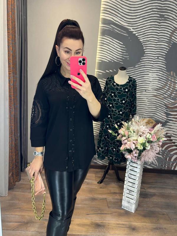 шикарна блуза серії люкс ідеальне поєднання високої якості і цікавого дизайну, блуза прямого крою з відкладним коміром, розрізами по бічних швах, невеликих гудзичках спереду і рукавами 3/4 на манжетах, виконана з високоякісного щільного трикотажу, прикрашеного мереживом з ефектним візерунком і доріжками з блискучих страз розміри 48, 50, 52, 54, 56, 58 довжина 68-70 см, об'єм грудей по виробу залежно від розміру 106-126 см, довжина рукава від шиї 58-60 см код S 231124