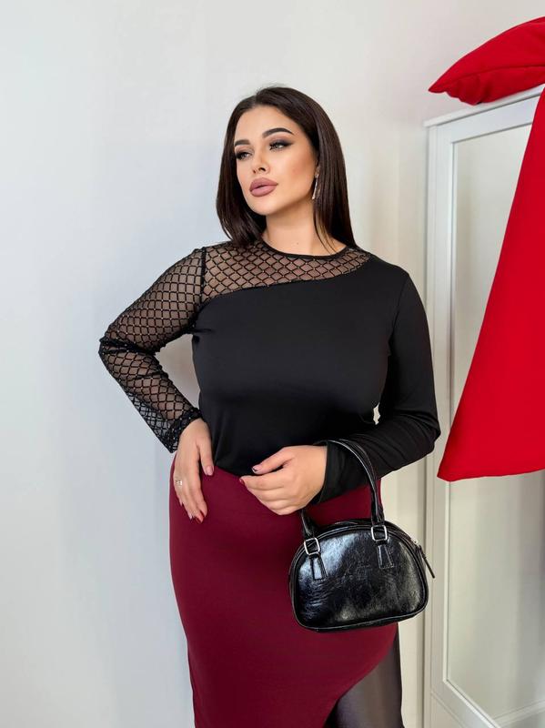Кофта арт. Click Дуже ніжна та жіноча кофтина, рукав сітка. Ви будете зачаровувати погляди. Будь сміливою! Розмір: 48-50, 52-54, 56-58 Тканина: мікродайвінг (дуже добре розтягується), сітка майже не тягнеться Колір: чорний, бордо, пляшка, бірюза