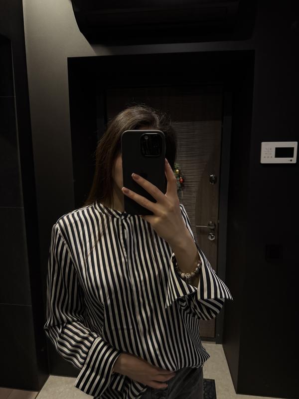 Подовжена сорочка з лініями - дуже гарно видовжує образ. В ідеальному стані. Підійде на розмір S/M