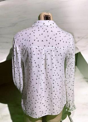 Біла сорочка з принтом у вигляді маленьких пташок у районі коміру зав'язки