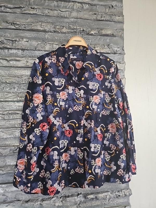 Легка комфортна сорочка, натуральний склад, хоча бирка відсутня. Ненав'язлива квіткова гама. Відмінно виглядає на майку, футболку. Напівобхват грудей 66 Напівобхват стегон 67 Рукав 62 Жлина 70 Тканина не тягнеться. Можу до сорочки запропонувати комфортні штани льняні на фото відповідного розміру.