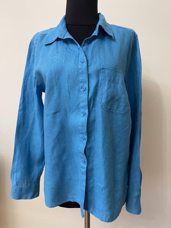Жіноча сорочка блакитного кольору. Бірка з брендом, розміром і складом тканини зрізана. На вигляд льон/ котон. Плечі 41 см, ПОГ 50 см, ширина низу 50 см, довжина 66 см. Рукав 59 см. Стан ідеальний, без дефектів.