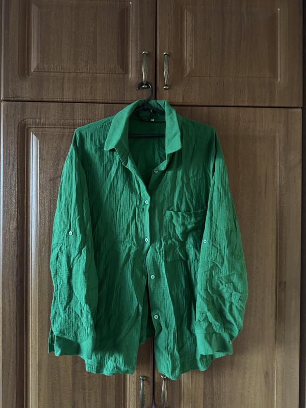 Зелёная рубашка с возможностью подкатывает рукава в три четверти. На пуговицах. Размер М. Можно с Оверсайз
